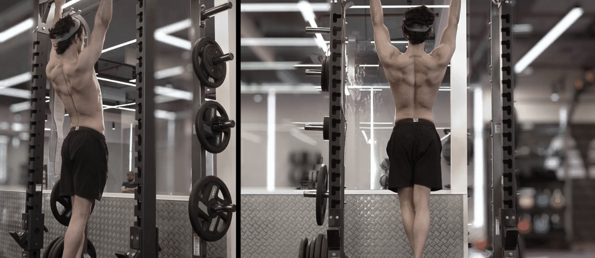 Hang from the pull-up bar with palms overhand grip. The grip should be at a slightly wider than shoulder-width distance.